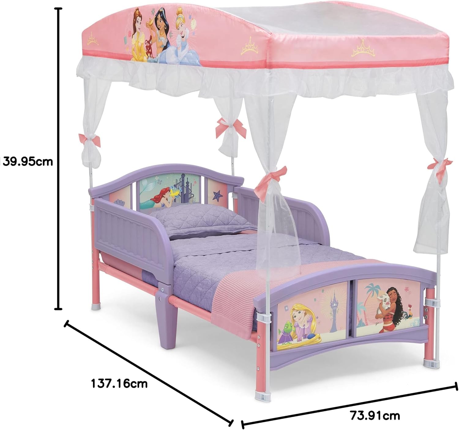 - EASY TRANSITION FROM CRIB TO BIG-KID BED: Features two attached guardrails with low to the ground design at ideal kid-sized height; Enables safe and easy access in and out of bed; Colorful Disney Princess canopy creates a dream bedroom for your little one