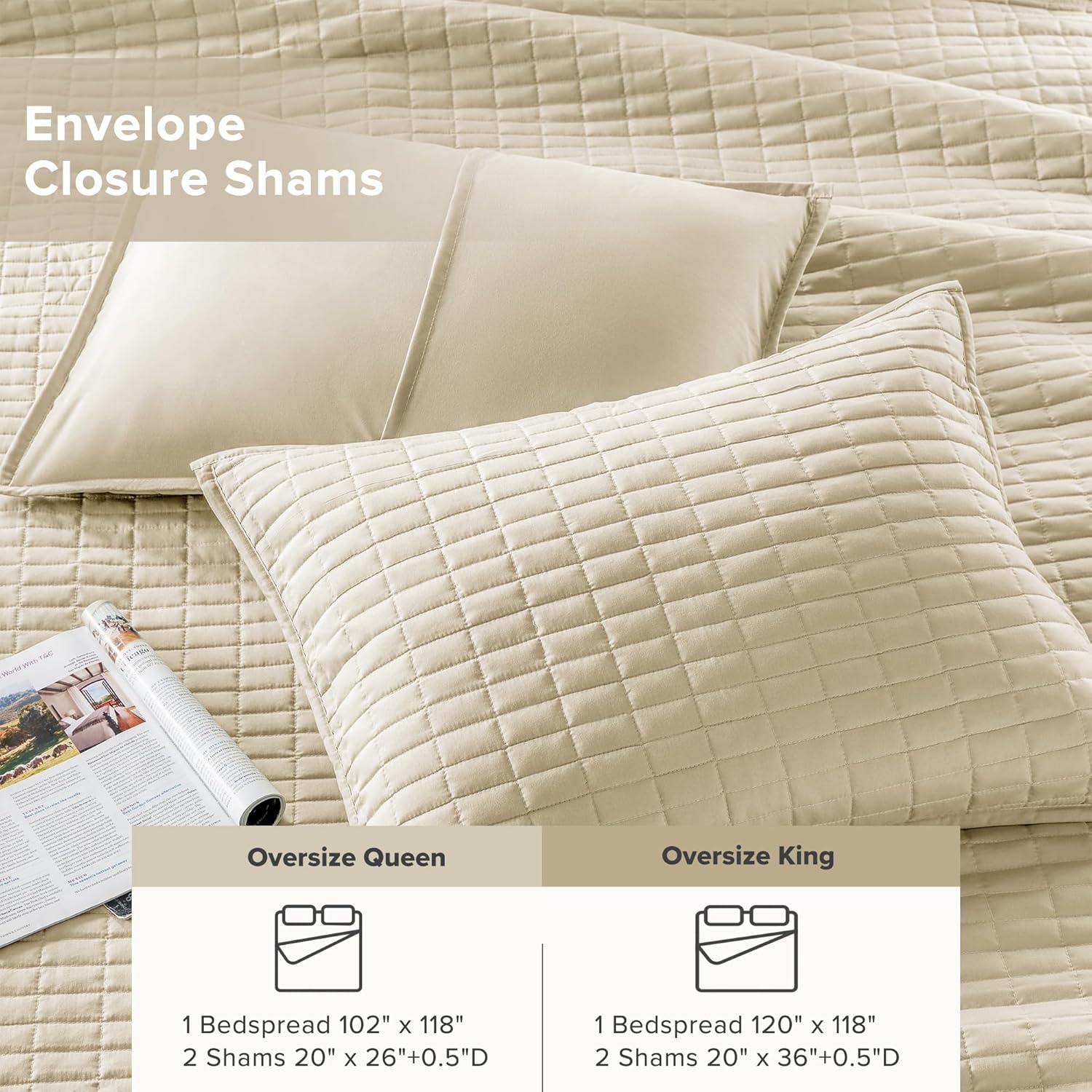 • BED COVERAGE - KING size BEDSPREAD : 120"W x 118"L. BEDSPREAD coverage covers the entire STANDARD SIZE KING MATTRESS (76" width) and hang down with approximately 22" DROP on each side from the top of the bed