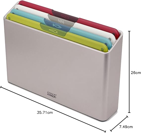 The Joseph Joseph 4-piece Chopping Board Set with Storage Case offers a practical and hygienic solution for food preparation. Each board is color-coded to prevent cross-contamination, making it easy to designate specific boards for meat, fish, vegetables, and cooked foods. Crafted from durable, easy-to-clean materials, these boards resist stains and odors. The included storage case keeps the set organized and compact, saving valuable kitchen space while ensuring the boards stay clean and protected. Ideal for both professional chefs and home cooks, this set enhances kitchen efficiency and food safety.