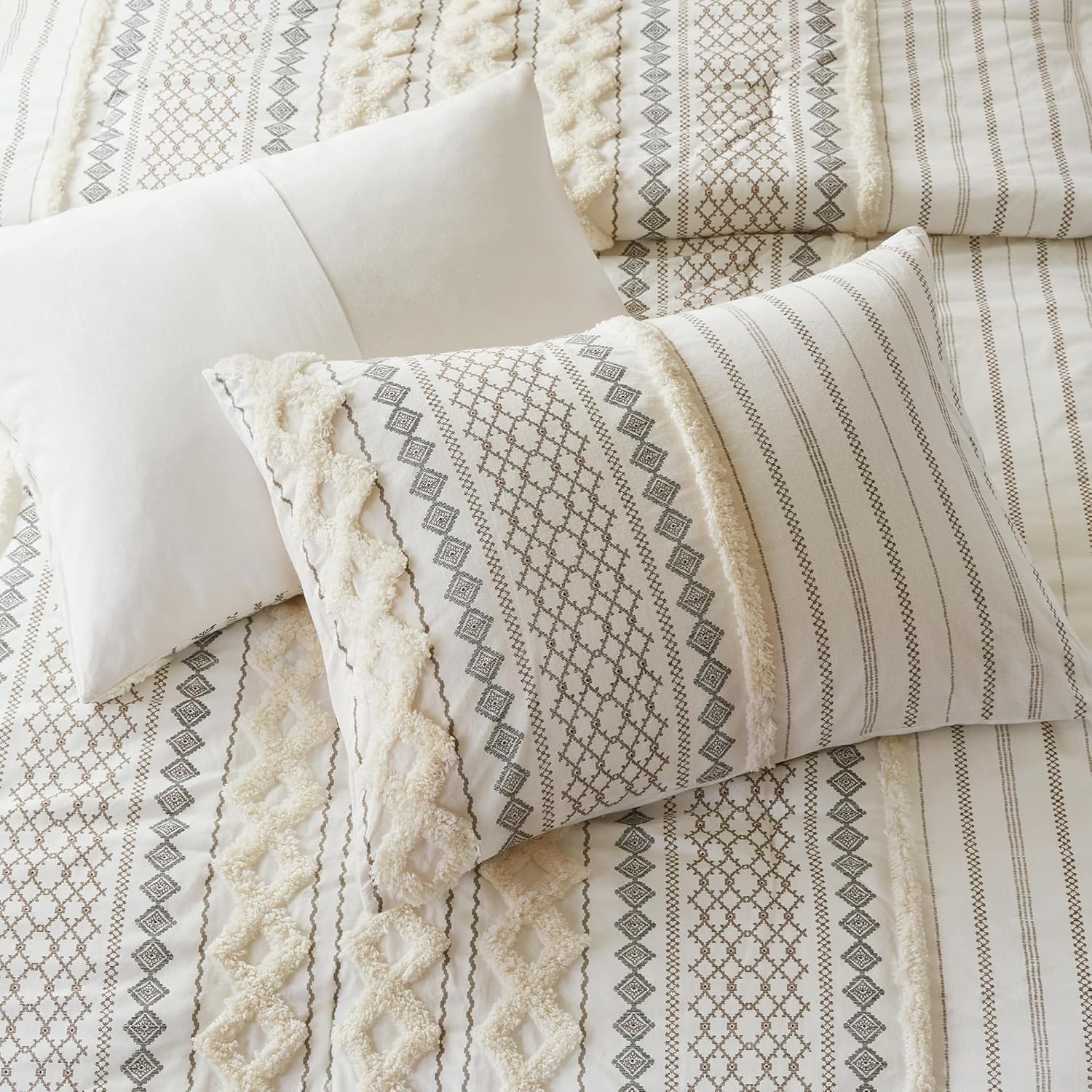INK+IVY Comforter for Queen Size Bed, Chenille Tufted, Breathable Cotton Comforter Set Queen, All Season Modern Boho Comforter with Farmhouse Bedding Flare, 2 Matching Shams, Queen Ivory 3 Piece