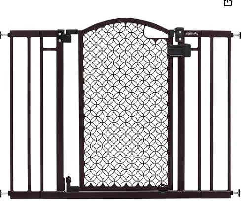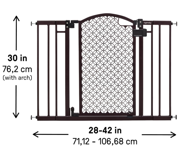 - STYLISH BABY GATE: This decorative baby gate is made of metal with a Espresso finish and has a decorative arched door, so you can child proof your home in style. Standing 30” tall, it is ideal for use with toddlers and small pets.