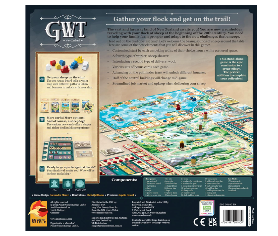 • NEW UPGRADED CONTENT: New Zealand features a customized start by each player unlocking a disc of their choice from a white cornered space. New elements include a sheep shearer worker, wool delivery, and various sets of bonus cards each game.
