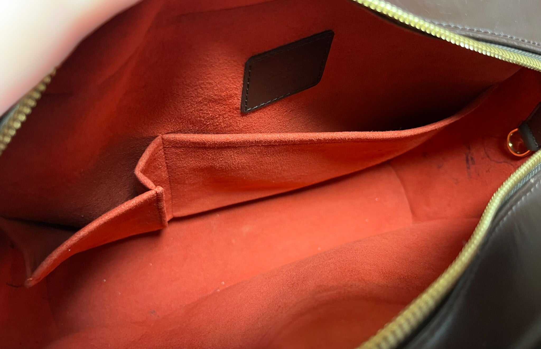 - Crafted from durable Damier Ebene coated canvas, with smooth chocolate cowhide leather trim and base. The interior is lined with a red or orange microfiber, often Alcantara, depending on the year of production.