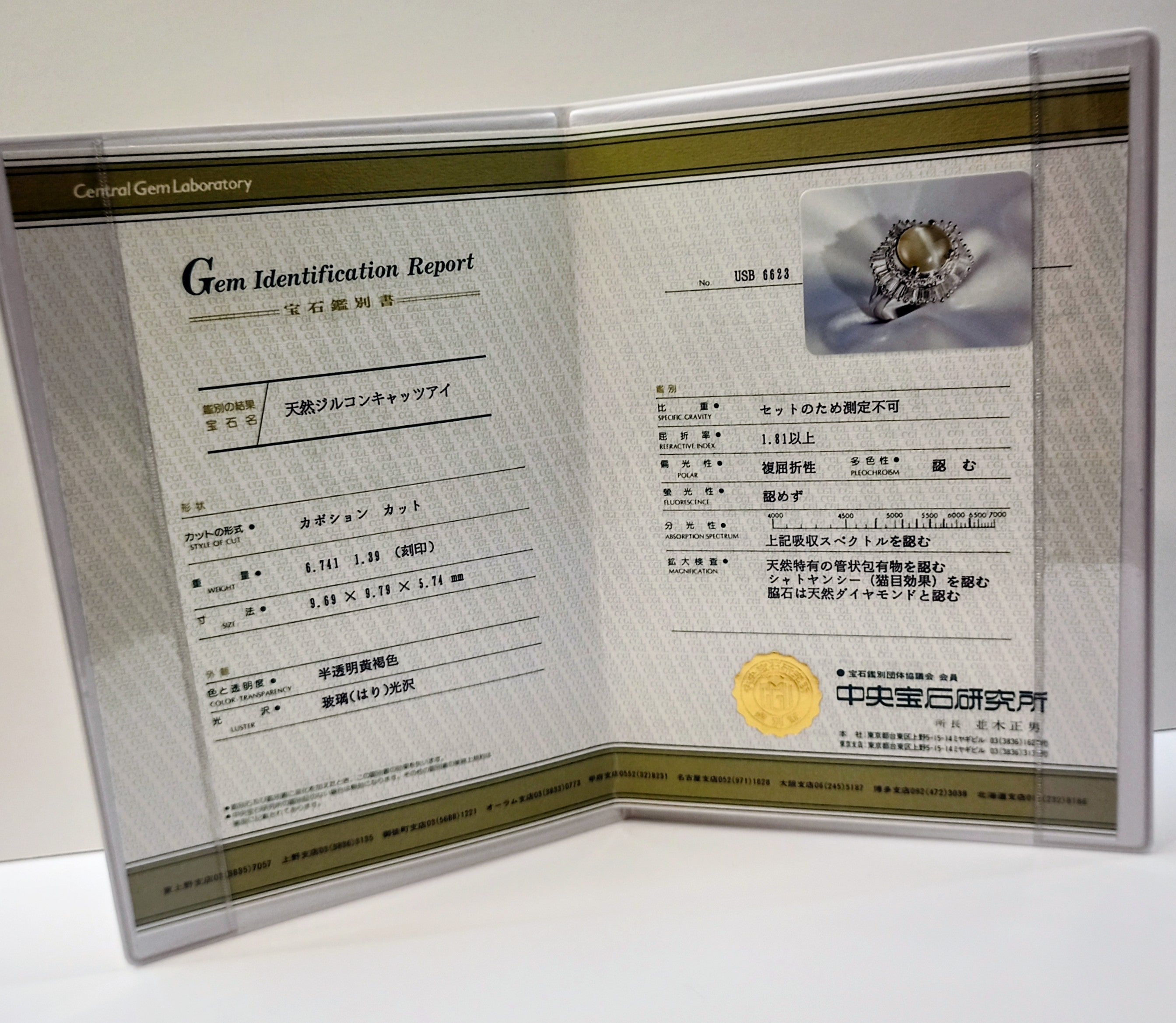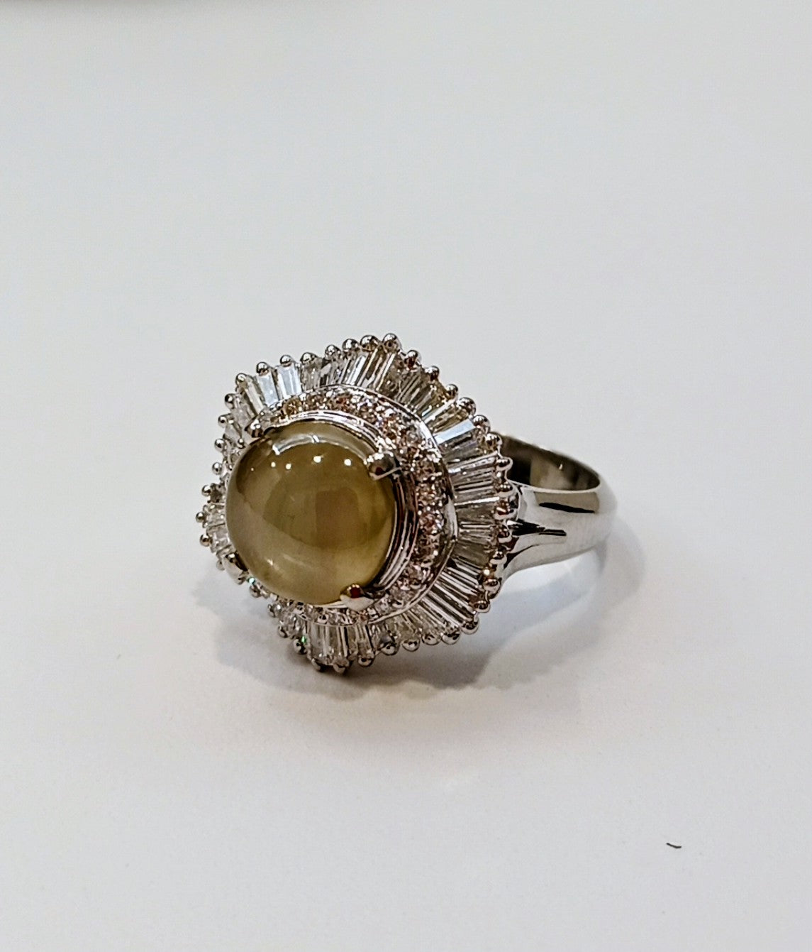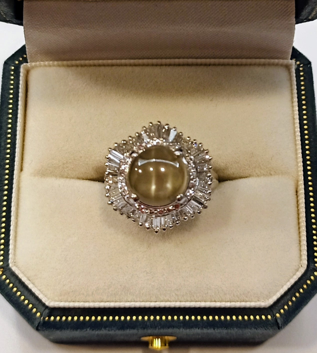 RING CAT'S EYE , PT900/ZIRCON CE1=6.741CT/MD=1.39CT/11.7G/CERT
