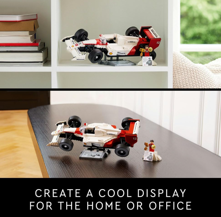 - Desk decor for the home and office – Includes a McLaren MP4/4 display stand with printed vehicle statistics and an Ayrton Senna minifigure display podium with a photo and iconic Senna quote