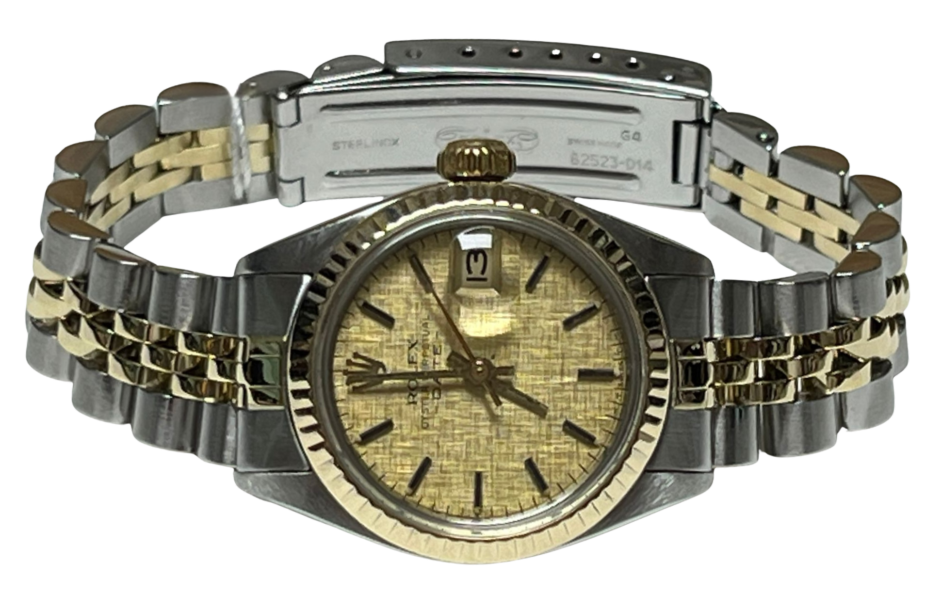 - Materials: Two-tone "Rolesor" (stainless steel and yellow gold) with a gold fluted bezel.