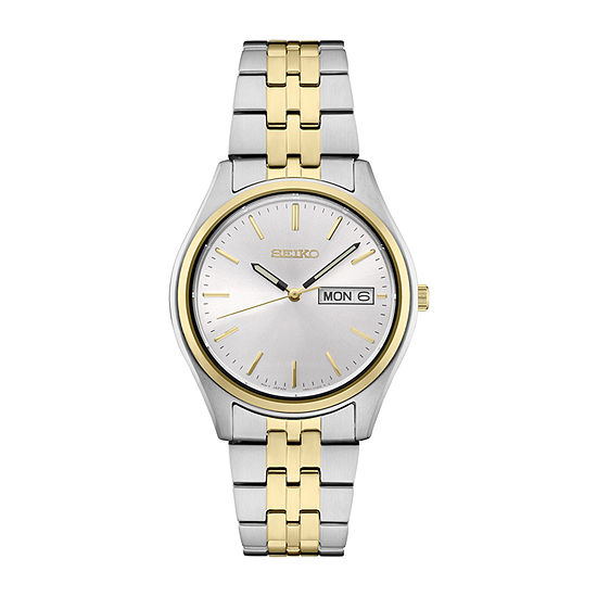 Stainless steel case with a two-tone (silver-tone and yellow gold-tone) stainless steel bracelet. Fixed gold-tone bezel. Silver dial with luminous black hands and index hour markers. Minute markers around the outer rim. Dial Type: Analog. Luminescent hands. Day of the week and date display at the 3 o'clock position. Quartz movement. Solid case back. Round case shape. Case size: 36.9 mm. Case thickness: 8.8 mm. Fold over clasp with a safety release. Water resistant at 100 meters / 330 feet. Functions: date, day, hour, minute, second. Essentials Series. Dress watch style. Watch label: Japan Movt. Seiko Essentials Quartz Silver Dial Mens Watch SUR430.