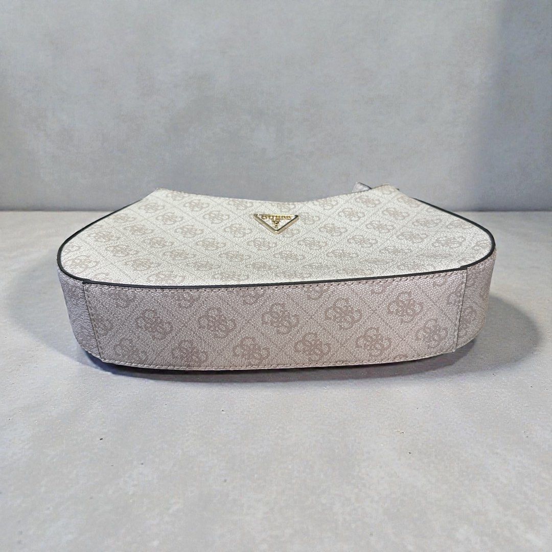 Guess Small Shoulder Bag in pristine white PVC, measuring 18cm height by 22cm length by 5cm width. This compact medium-sized bag combines practical dimensions with sophisticated styling, ideal for everyday essentials or evening occasions. The durable PVC material offers easy maintenance and a polished finish, while the shoulder strap design ensures comfortable, hands-free carrying. A versatile accessory that transitions seamlessly from casual to formal settings.