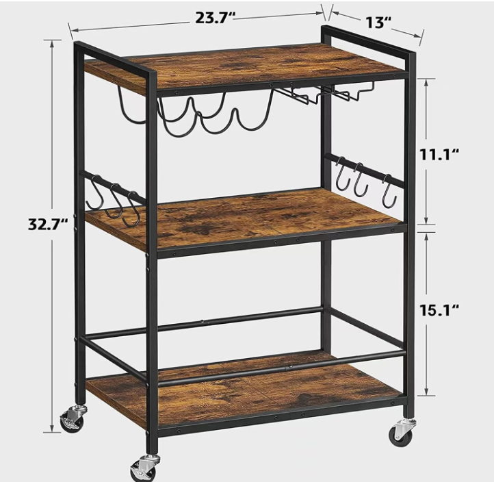 • [Large Capacity] Size: 13"D X 23.7"W X 32.7"H , This bar cart with Wine Rack and Glass Holder on the first tier that can hold up to 6 wine glasses and 3 compartments for wine bottle storage. It can also be disassembled if you don't want to use it. 3 Shelves allowing it enough room to hold your drinks and snacks as well as making it convenient enough to place in any room.