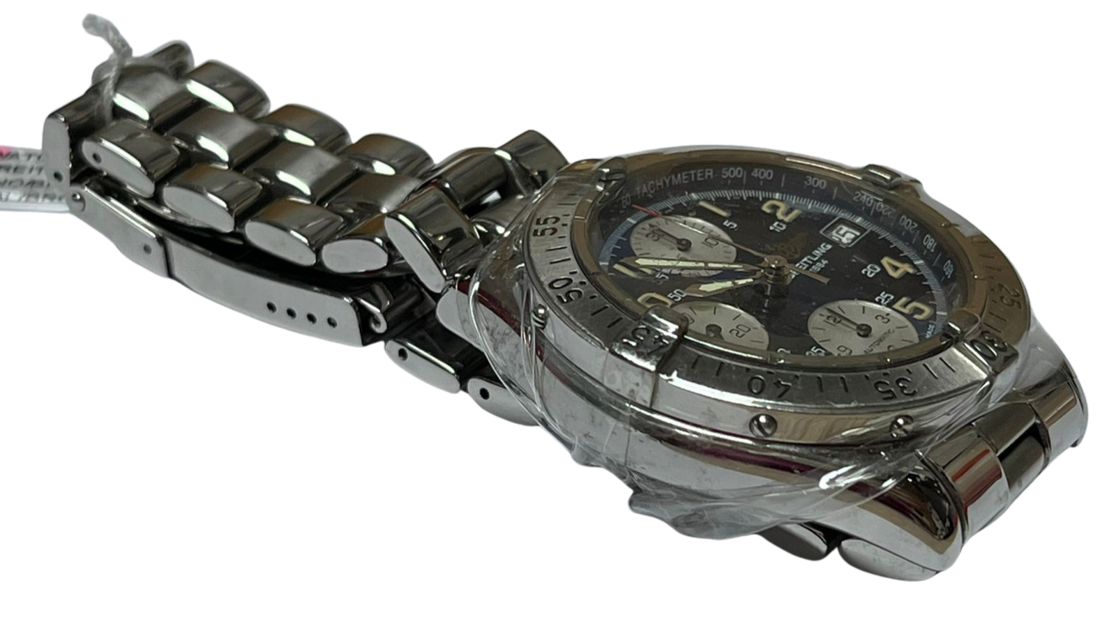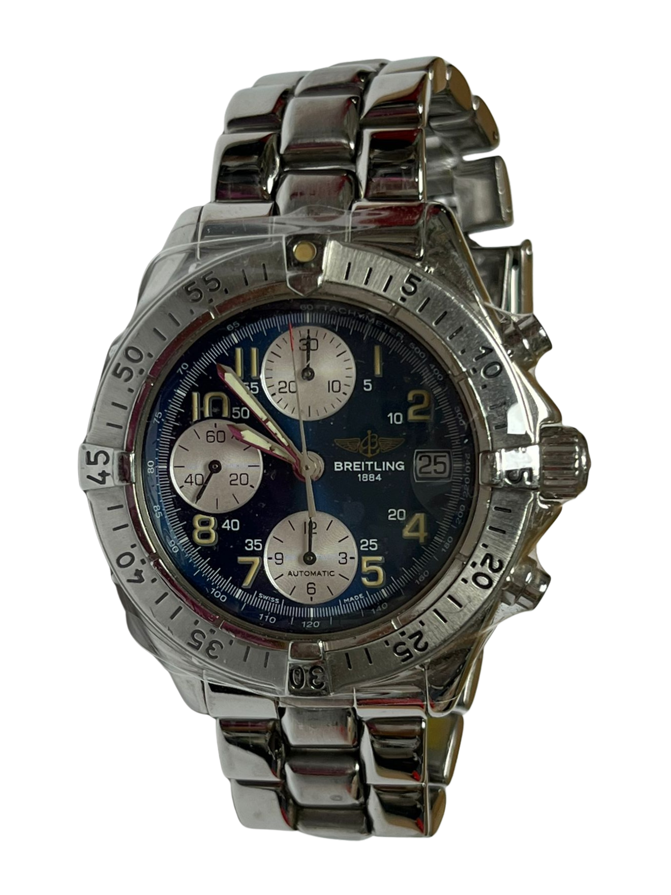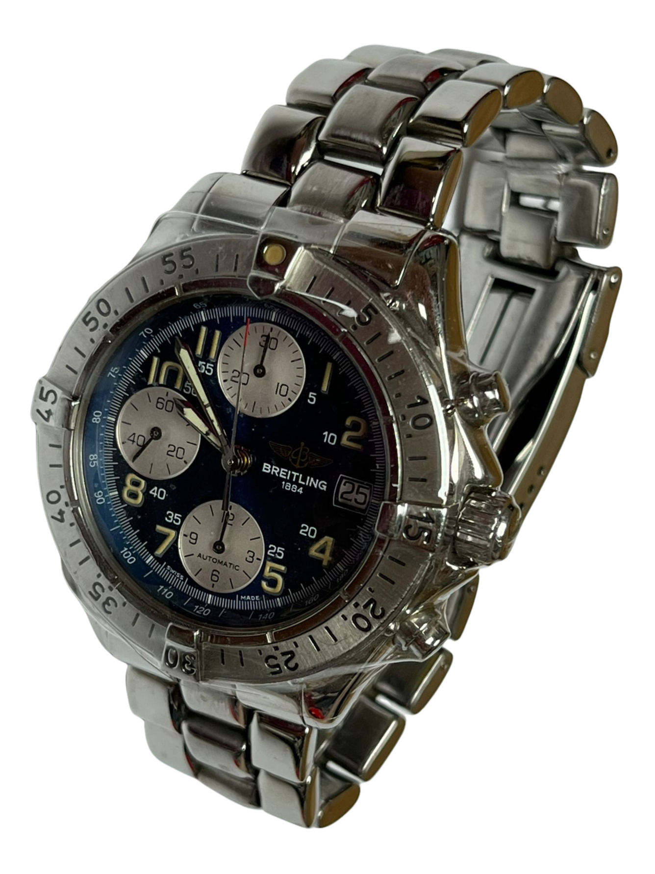 - Features: Chronograph functionality, blue dial with Arabic numerals, date indicator, and unidirectional rotatable bezel