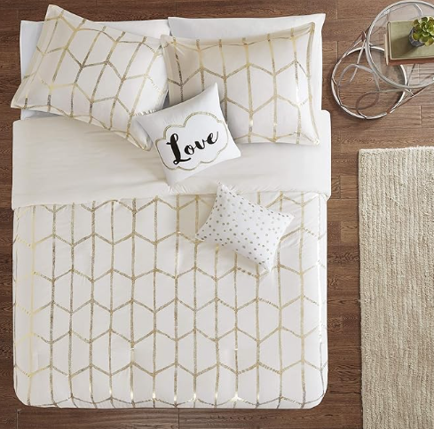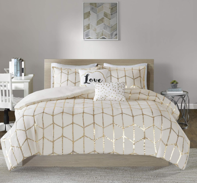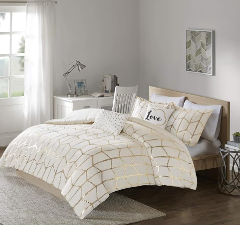• Freshen up your bedroom with the enchanting style of Intelligent Design’s Raina Metallic Printed Duvet Cover Set. The stunning duvet cover flaunts a geometric, metallic gold print against a soft ivory ground for a fun and eye-catching look! Matching sham(s) echo the design seen on top of the bed to pull the entire ensemble together. Two embroidered decorative pillows with typography and metallic details complete this fabulous, ultra-soft microfiber duvet cover set. Button closures allow