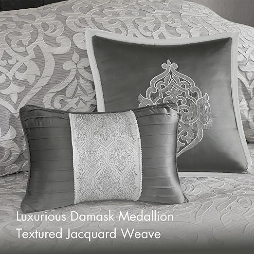 Madison Park Odette Cozy Comforter Set Jacquard Damask Medallion Design - Modern All Season, Down Alternative Bedding, Shams, Decorative Pillows, King(104 in x 92 in), Silver 8 Piece