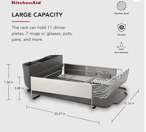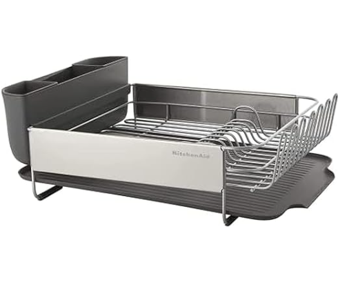 KitchenAid Large Capacity, Fully Size Self Draining Rust Resistatant Satin Coated Dish Rack with Removable Flatware Caddy 20.47-Inch, Gray
