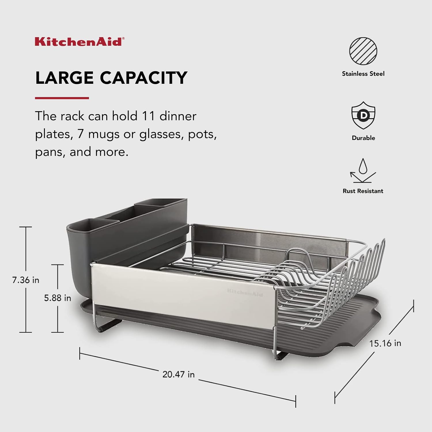 KitchenAid Large Capacity, Fully Size Self Draining Rust Resistatant Satin Coated Dish Rack With Removable Flatware Caddy 20.47 Inch Gray