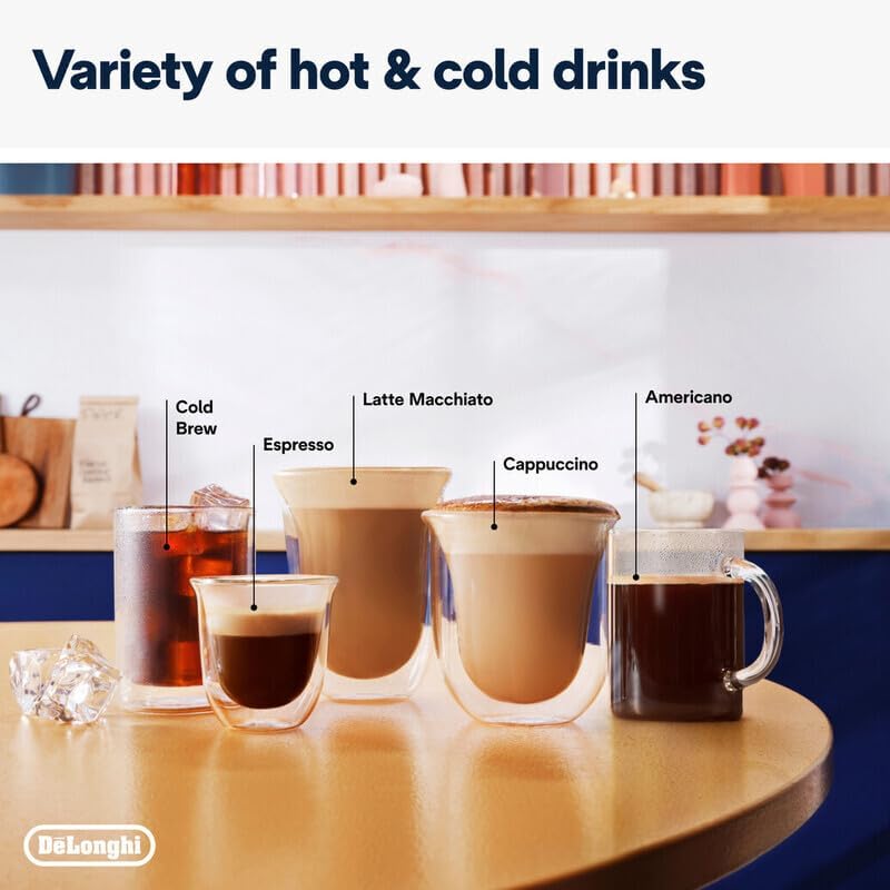 • WITH COLD BREW: Enjoy 4 Pre-set recipes. Recipe selector to choose from Espresso, Long Black, Cold Brew or Hot Water. Make a refreshing Cold Brew in under 5 minutes* thanks to the exclusive Cold Extraction Technology