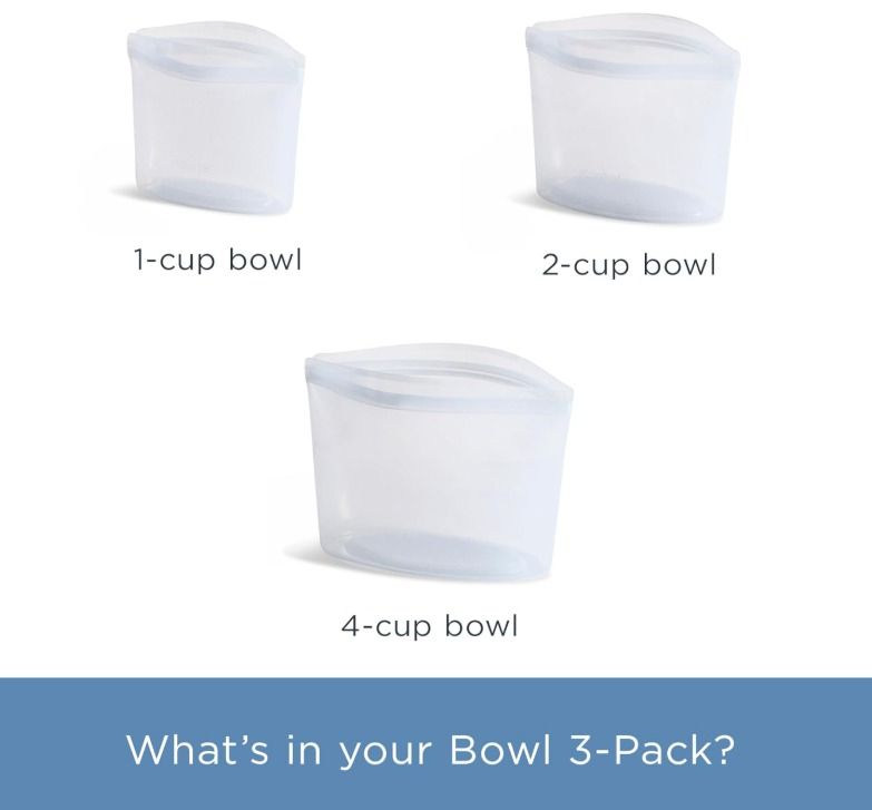 - CONTAINS: 3 Stasher Reusable Silicone Bowls in the color Clear. Includes 1 Cup (8 Fl Oz), 2 Cup (16 Fl Oz), and 4 Cup (32 Fl Oz) Bowl.