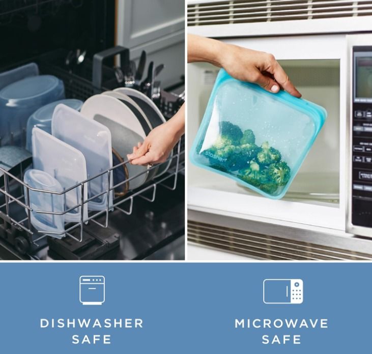 - REUSABLE, REWASHABLE CONTAINERS: Stasher silicone reusable storage bags make it easy to ditch single-use plastic and meet endless household needs. Safe for the dishwasher, microwave, oven (up to 425°F), and more.