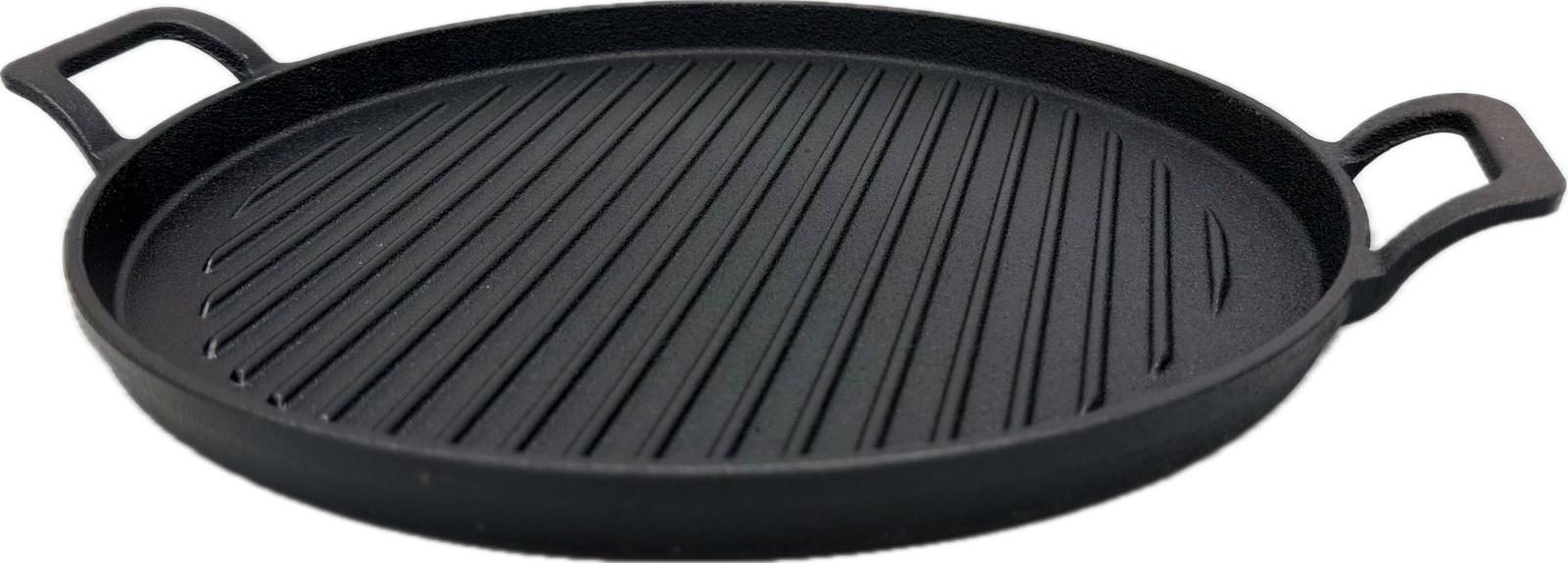 A durable 28cm round cast iron grill tray designed for superior heat retention and even cooking. Ideal for grilling meats, seafood, and vegetables, it creates perfect grill marks and enhances flavor whether used on the stovetop, in the oven, or on a barbecue.