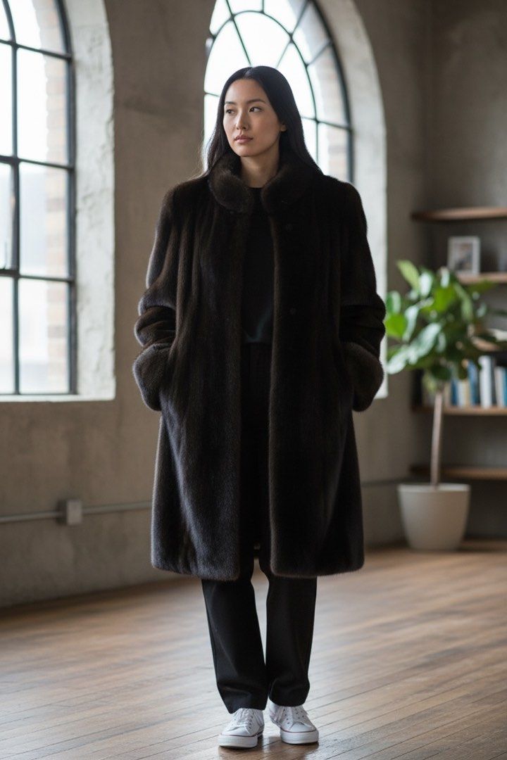 Luxurious mink coat in classic black, measuring 88cm in length and 52.5cm in width. This timeless piece features the natural softness and warmth characteristic of genuine mink fur, offering both elegance and exceptional insulation. The generous proportions provide comfortable coverage, making it suitable for formal occasions or refined everyday wear. A sophisticated investment piece that combines enduring style with premium craftsmanship.
