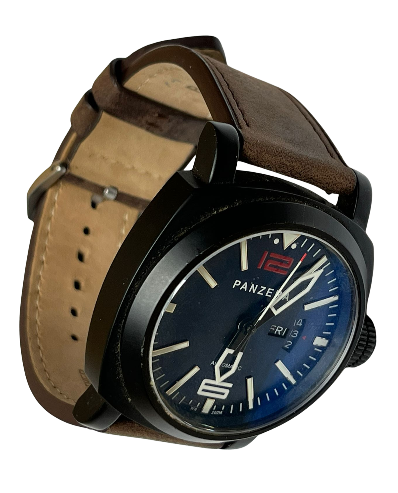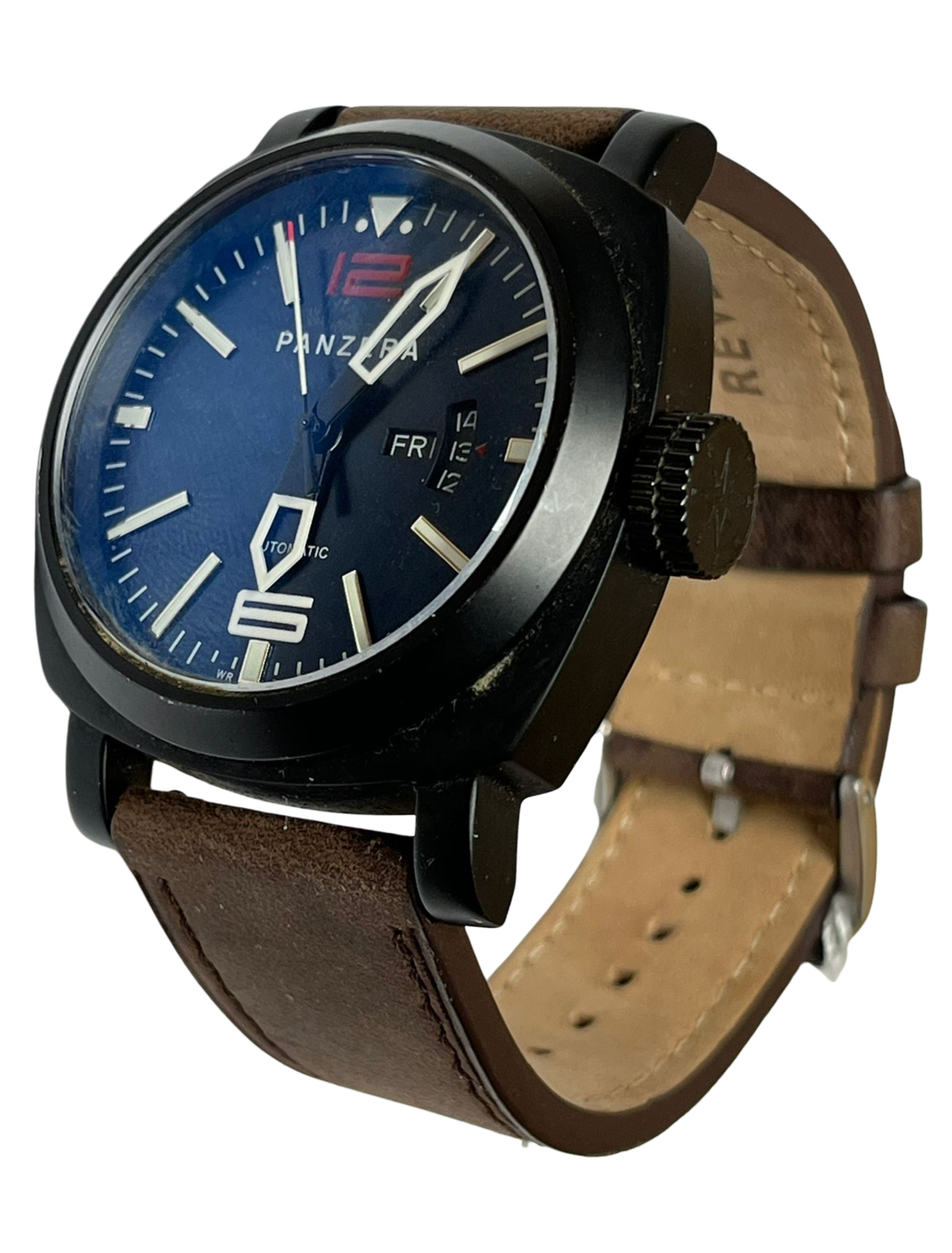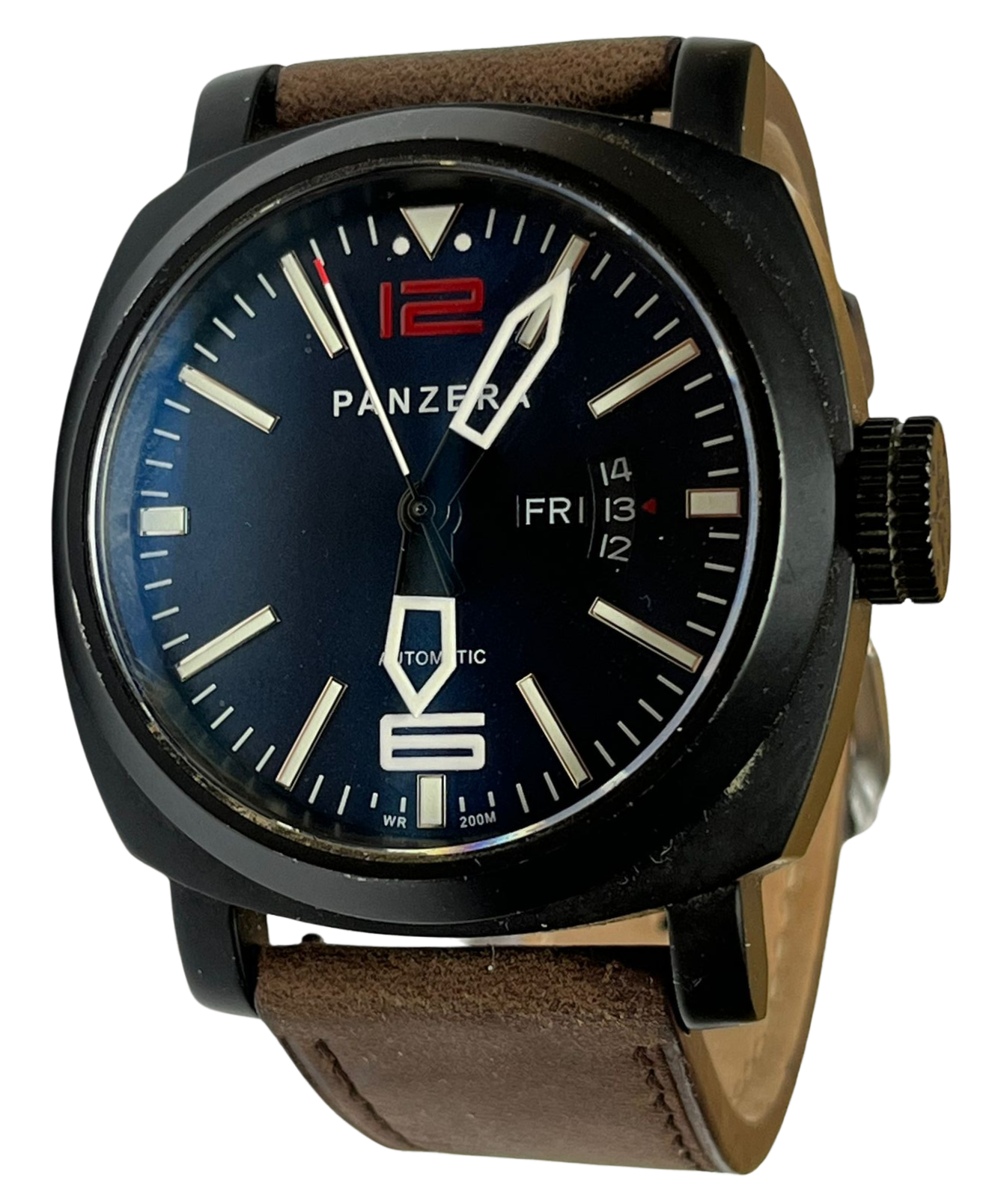 - Dial: Black dial with bold luminous indexes, hands, and a distinctive red "12".