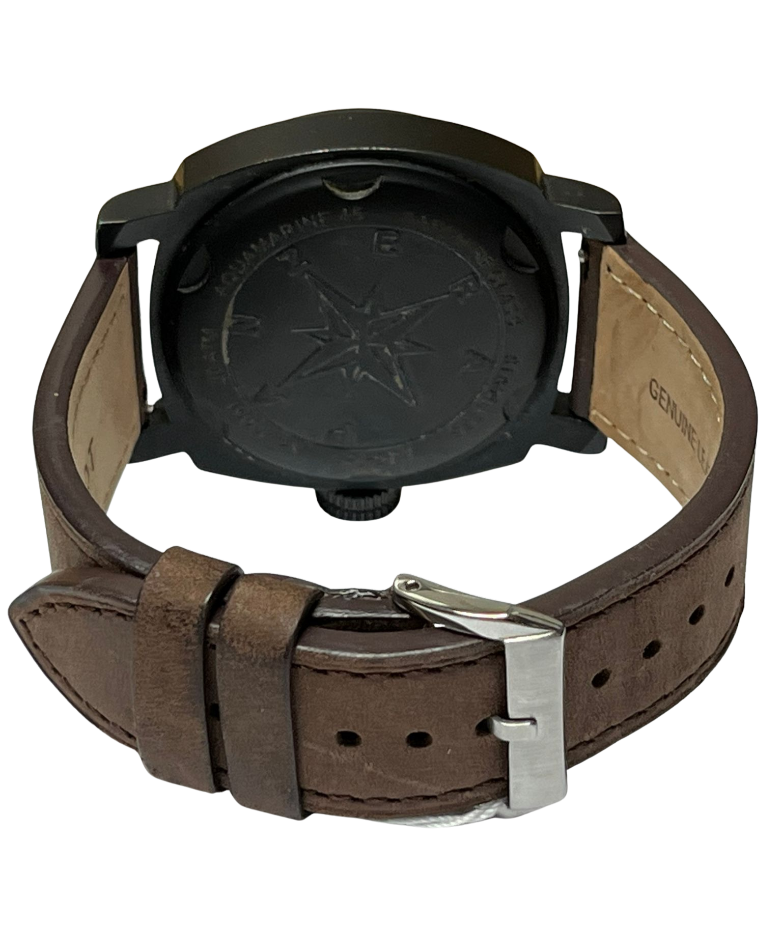 - Strap: Vintage-style brown leather strap.