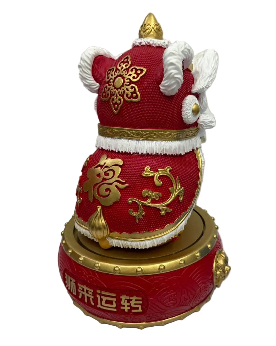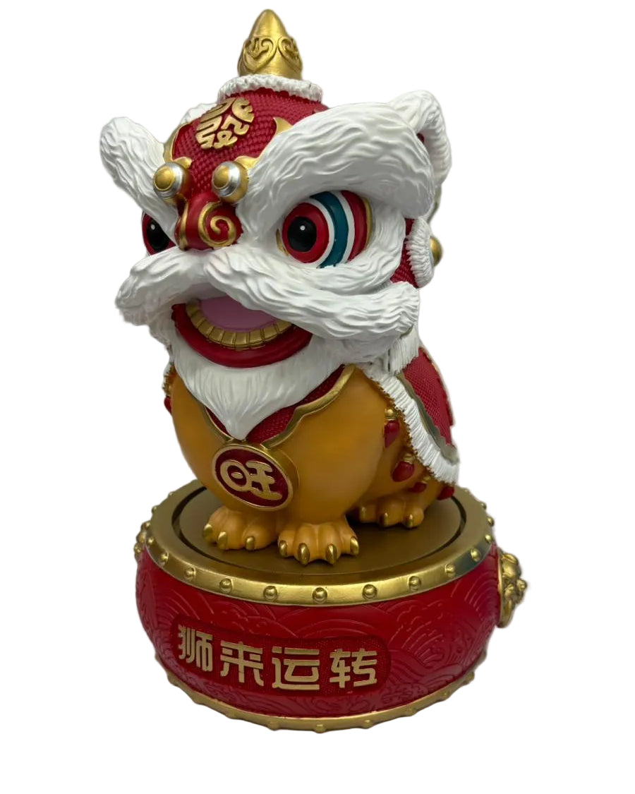 • Dynamic Lion Dance Design – Features a traditional lion dance figure poised on a spinning top, symbolizing celebration, luck, and cultural heritage.