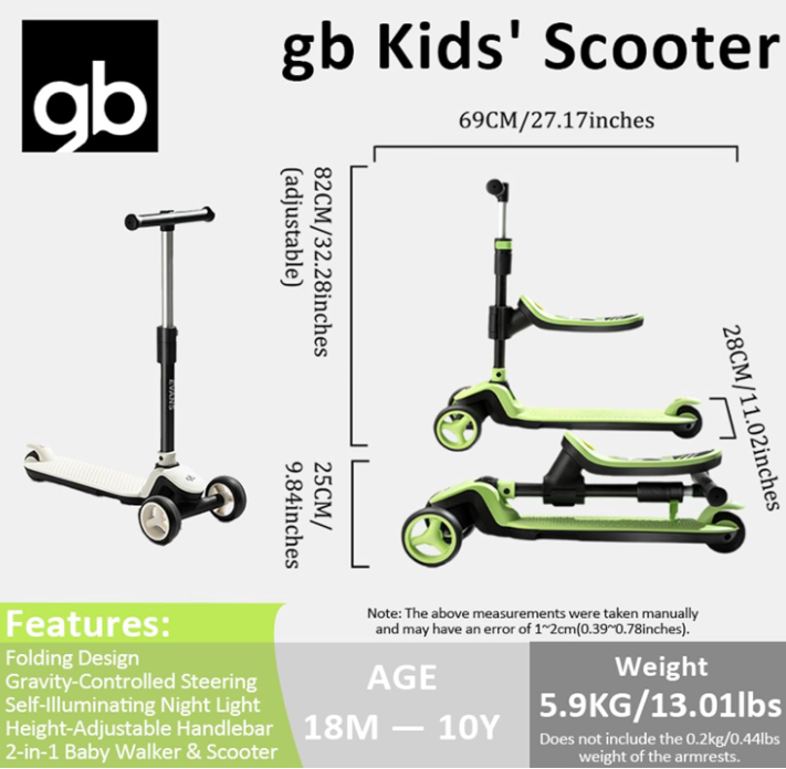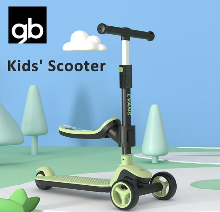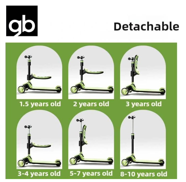 gb Kids Scooter with Removable Seat, Adjustable Height, LED Wheels, Ages 1.5-10 Years