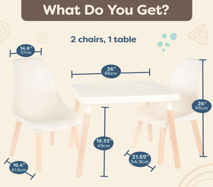 • Includes: This set comes with 1 kid-sized table and 2 ivory-colored chairs.