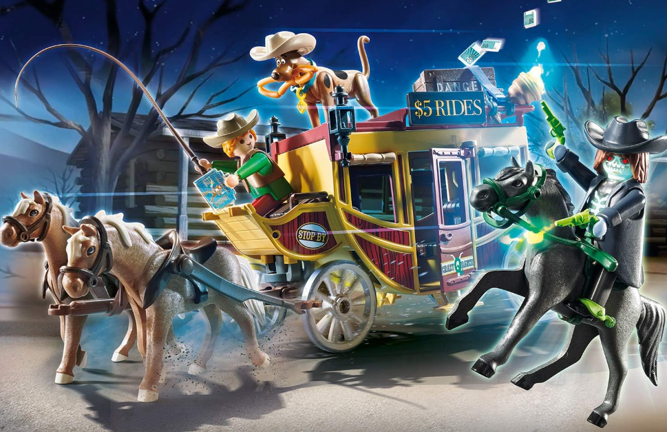 - Playset includes Scooby-Doo, Shaggy, ghost rider, horses, western stagecoach, collectible ghost card, money, and many other accessories
