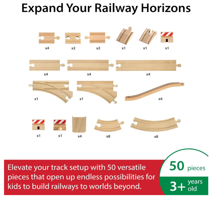 • 50 pieces of wooden track to create your won unique railway layout