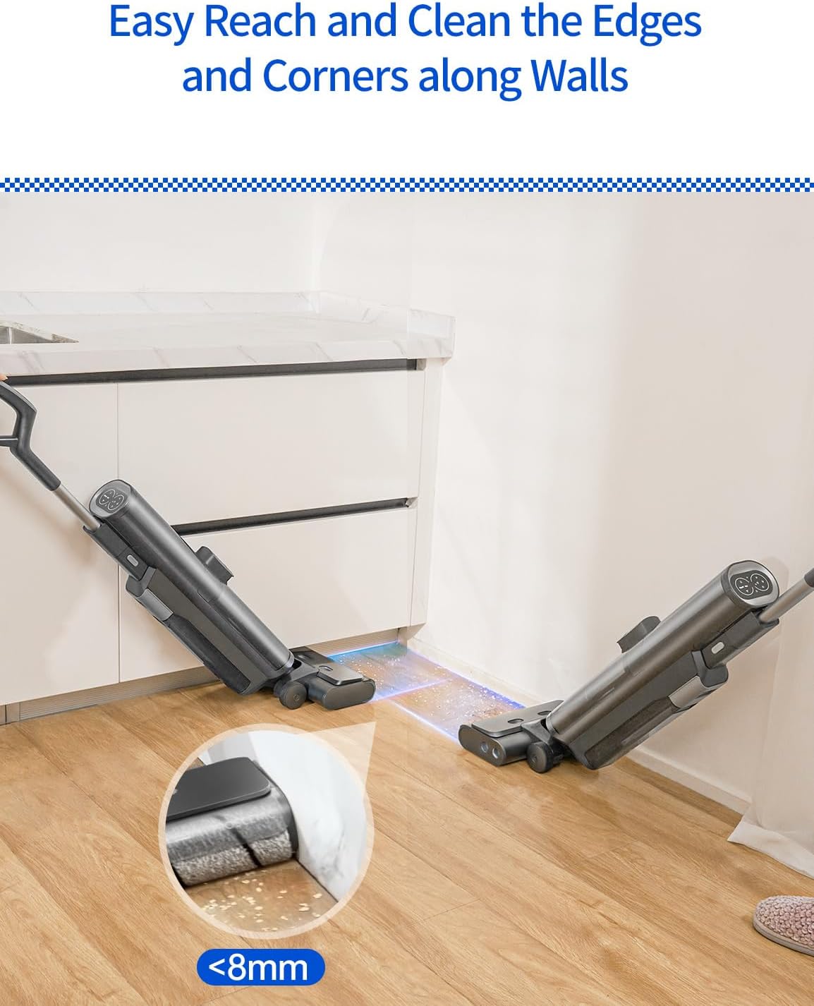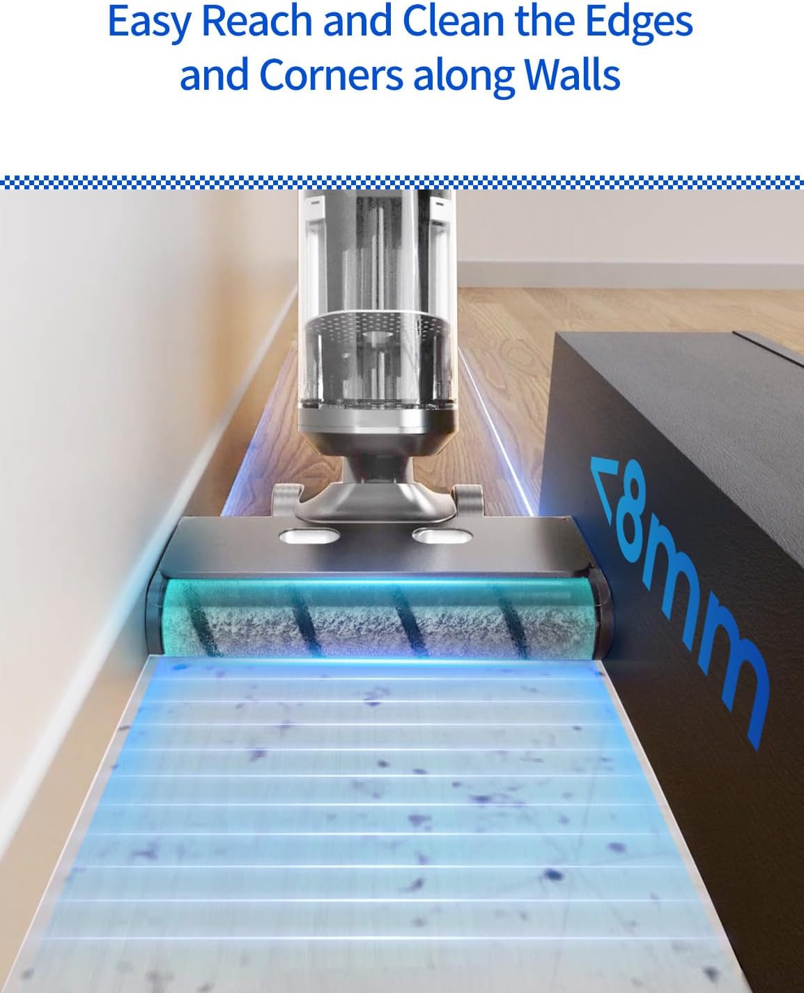 - Our mop vacuum combo has a unique Double Narrow Edge Design that can thoroughly reach and cleans the edges and corners of walls or other furniture, ensuring that there is no hidden dirt in these hard-to-reach places
