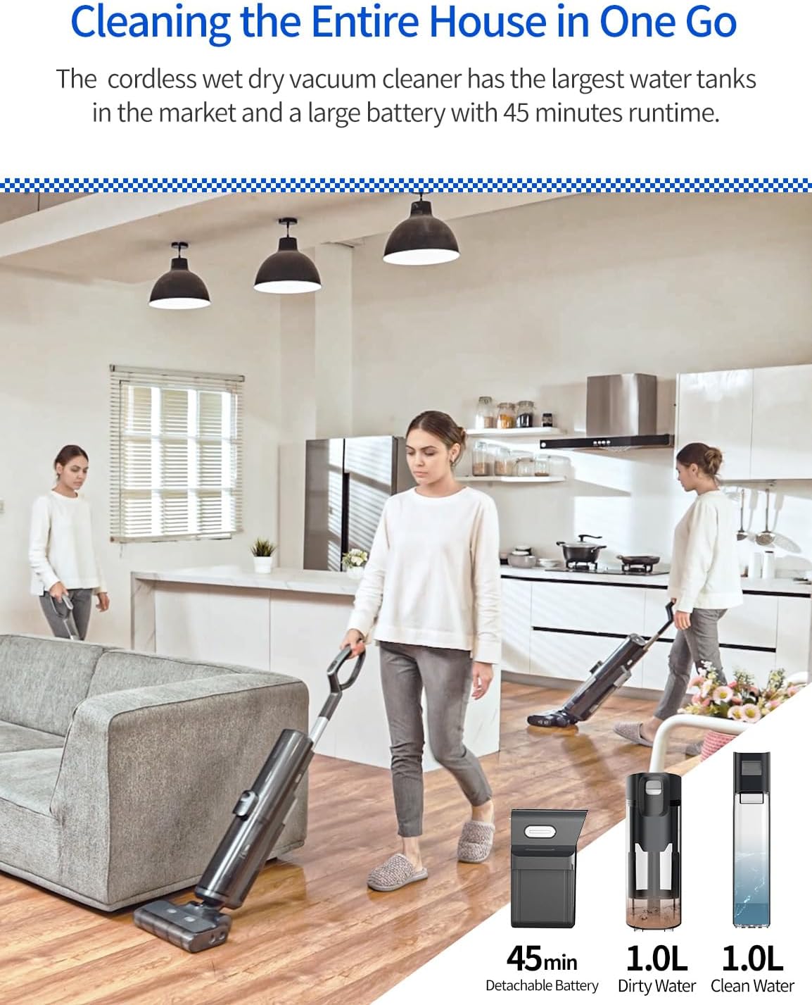 - The F20 vacuum mop has two large water tanks (1L clean water tank + 1L dirty water tank), reducing the frequency of water changes for efficient cleaning, and a removable battery ensuring that the whole house can be cleaned at once You can also purchase replacement batteries for extended use