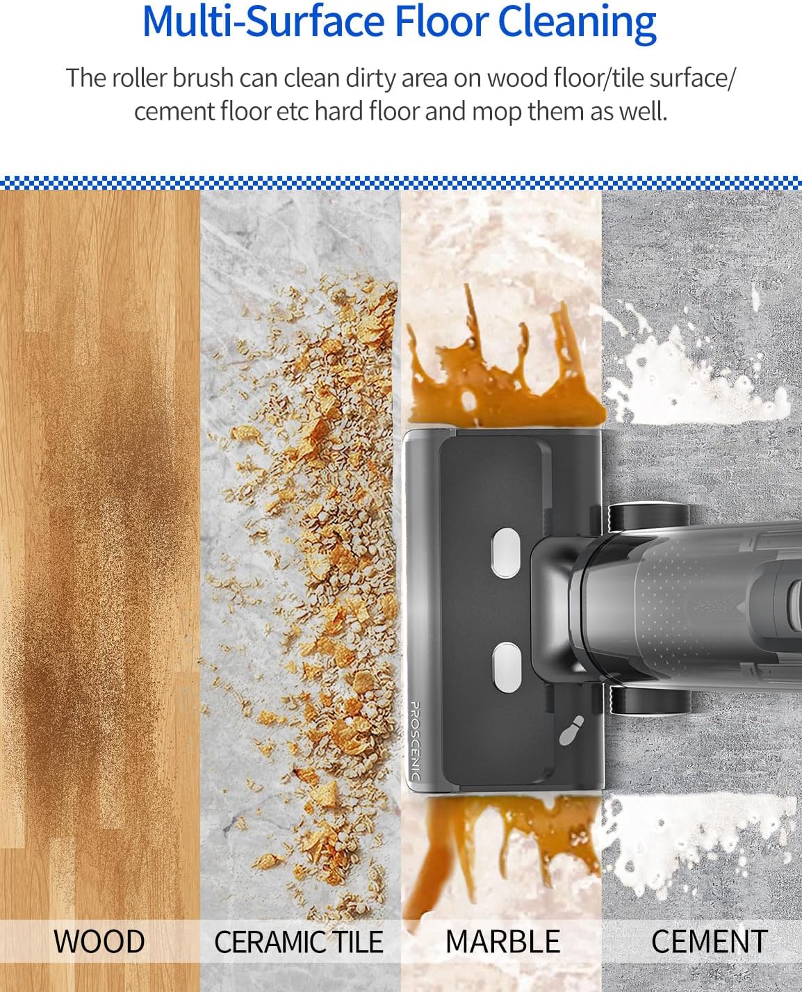 - It can pick up trash, and debris and clean dirty areas on hard floors such as wood/tile surfaces/concrete floors at the same time, and the roller brush will not cause scratches on the floor The self-cleaning function achieves fast, non-disturbing maintenance of the roller brush without leaving any odor, and realizes the function of vacuuming, mopping, washing, and drying all in one A Proscenic vacuum cleaner for hard floors is more convenient than a separate vacuum cleaner and mop