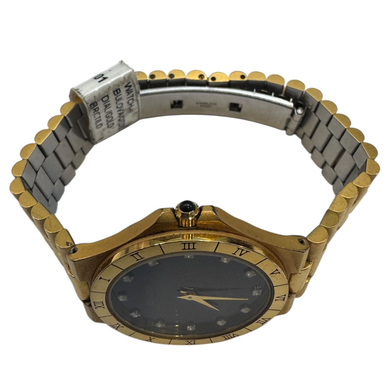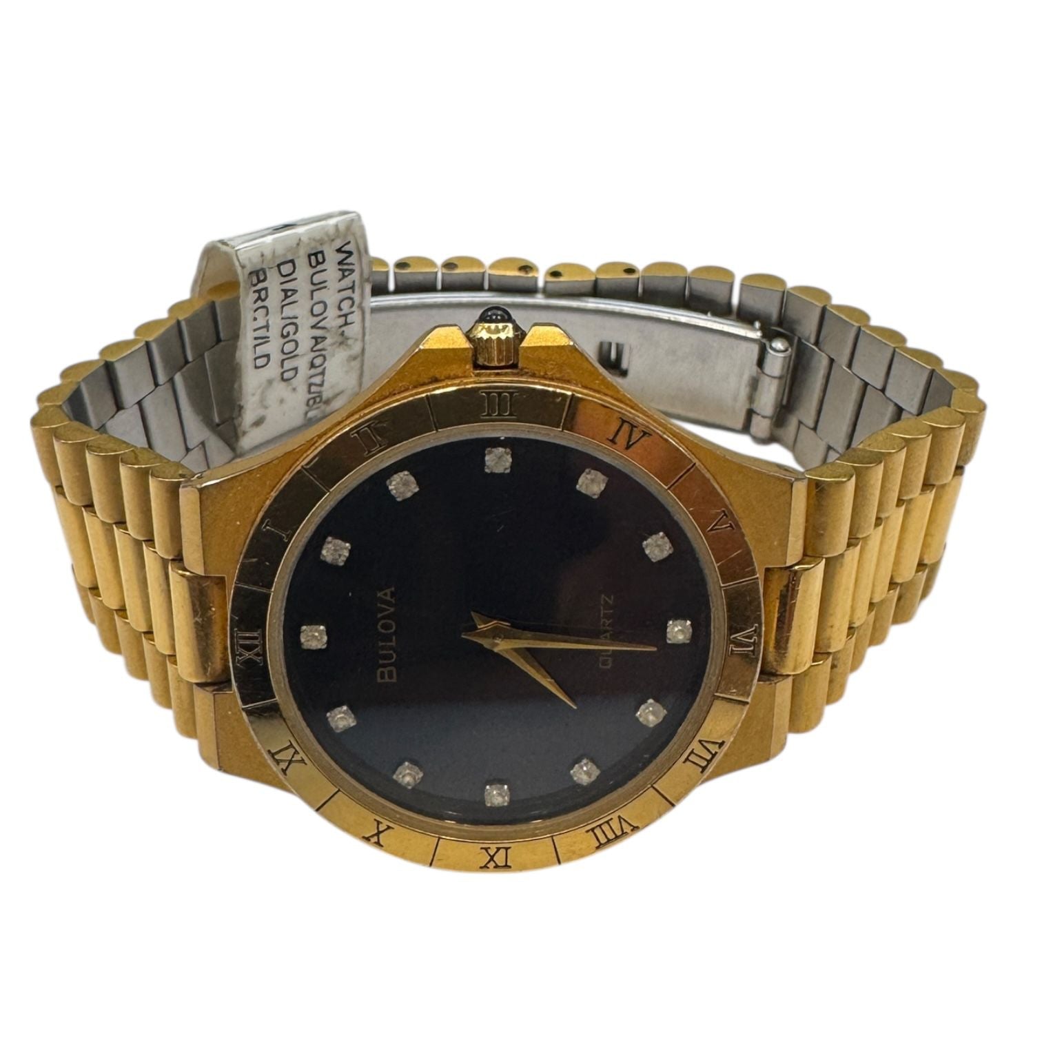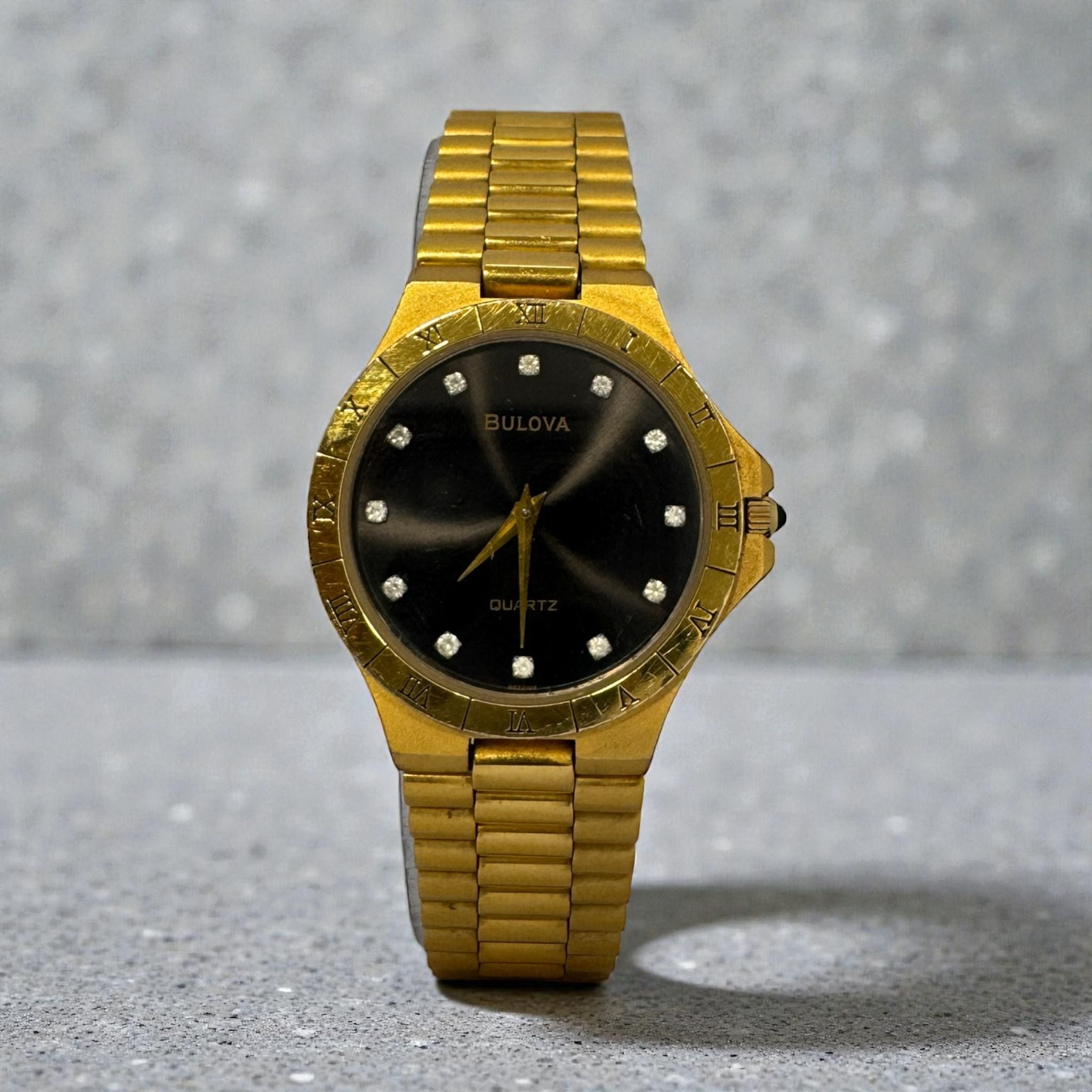 Vintage Bulova gold-plated Watch featuring a black dial with Crystal hour markers and a Roman numeral bezel