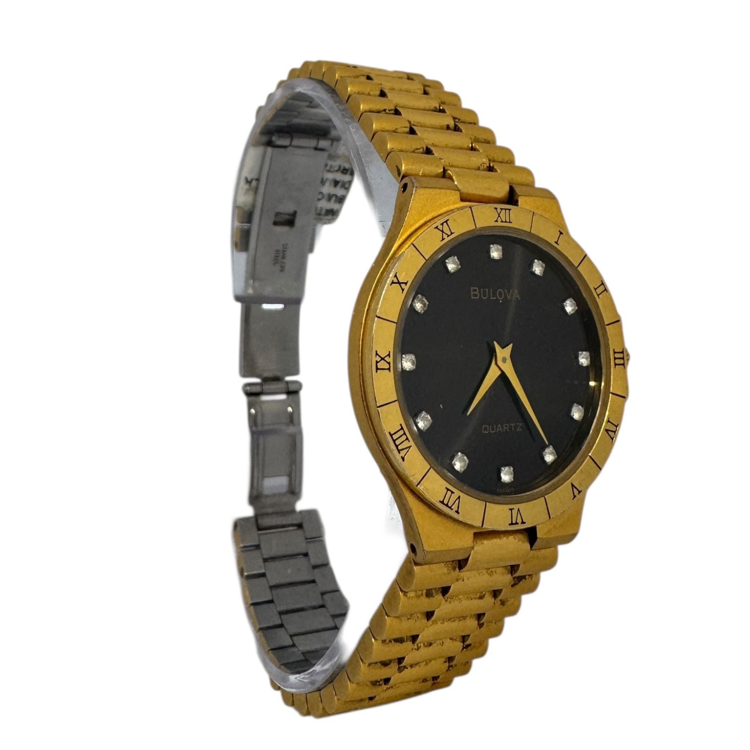 Vintage Bulova Longchamp gold-plated watch featuring a black dial with diamond hour markers and a Roman numeral bezel.